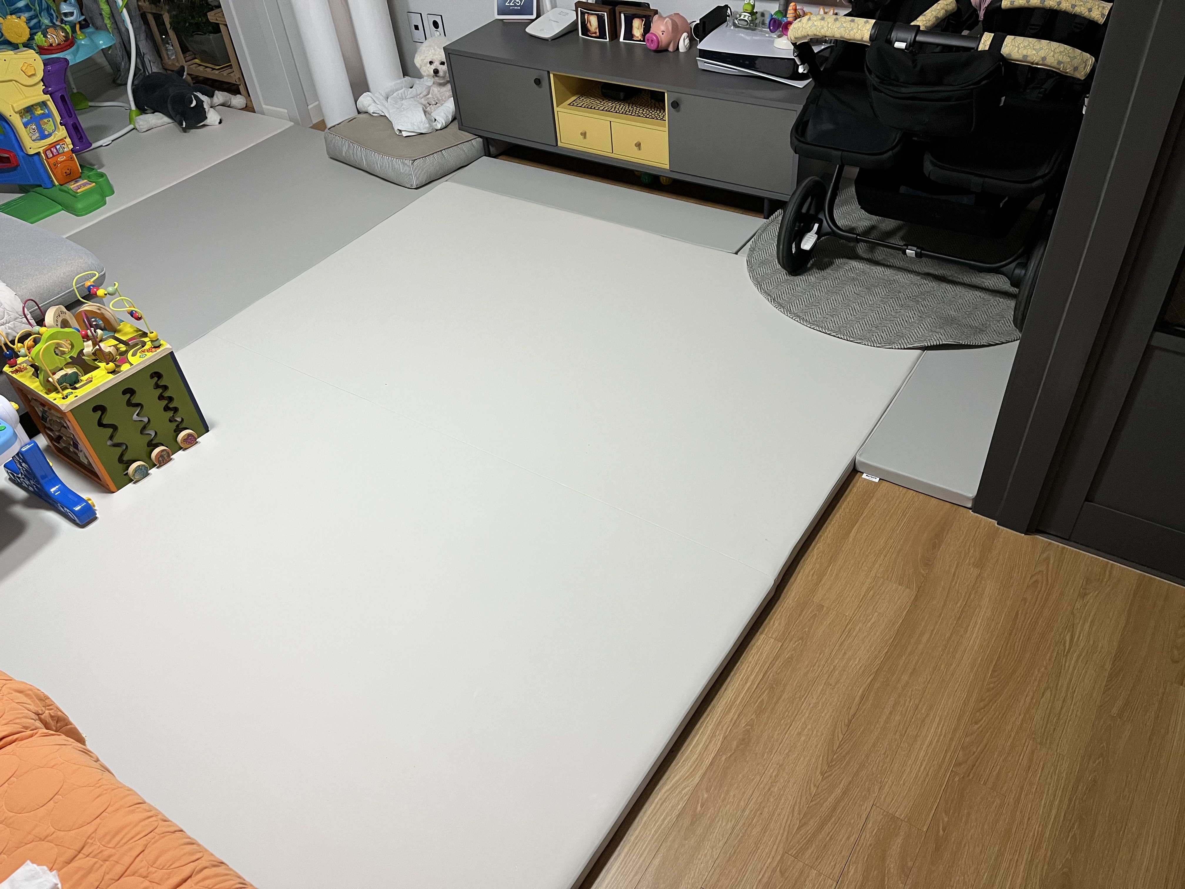 근데 사이즈가 안맞아 아오! 거실 전체를 두를 수가 없었다.